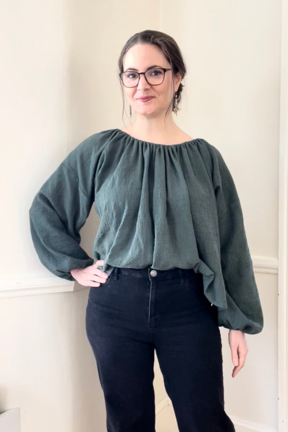 This was my first time having the patience to follow a pattern to sew a garment for myself. I’m SO glad I did. I did the view 2 top with gathered sleeve and cuff in an olive green double gauze. I didn’t cut the bottom of the top well but I don’t think it’s super obvious when worn. I JUST LOVE IT!! I can’t wait to do more renditions of this with a ruffled sleeve in a dress and different patterns and colors.